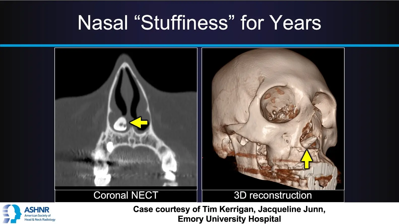 CT case of ectopic supernumerary tooth in the nasal cavity causing chronic obstruction. By Tim Kerrigan and Jacqueline Junn, Emory University Hospital.