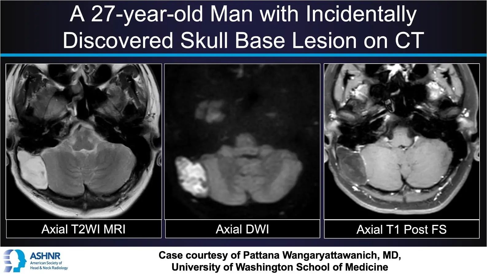 MRI case of intradiploic epidermoid cyst of the skull base in a 27-year-old man. By Pattana Wangaryattawanich, MD, University of Washington.